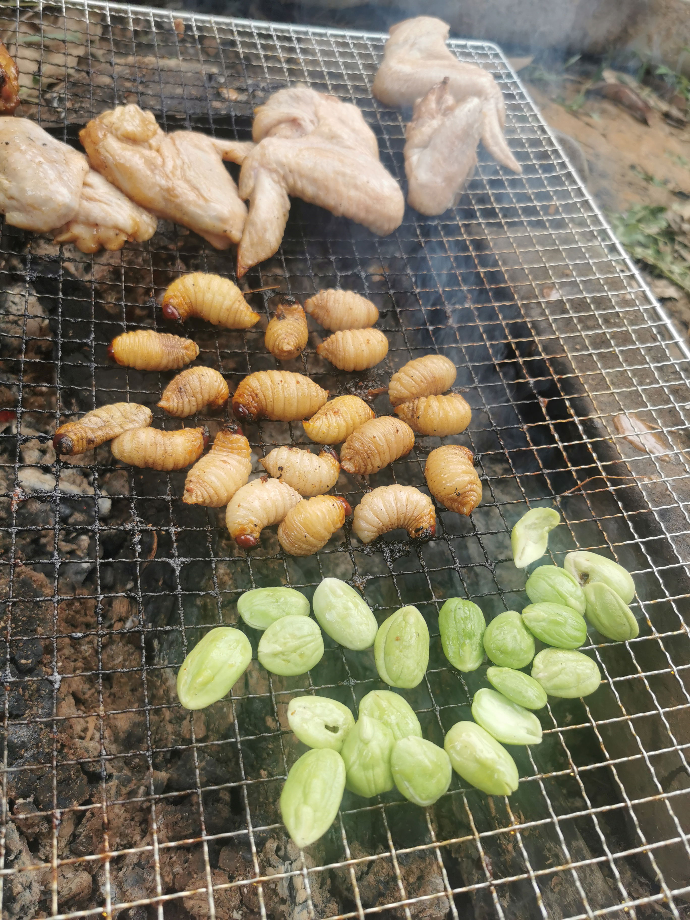 After placing all our goods, I saw Calvin’s father-in-law, moving swiftly through the bushes, and the next thing I knew, he was back with some woods. I am truly amazed with how he can make wonder by only using his parang knife. “Chop”, “Chop”, “Chop”, and big piece of wood was chopped into many small pieces. Next thing he did, he took out a small plastic bag of smashed palm fruits. He lit up few pieces of palm fruits, and started the fire to burn those collected woods, turning them into charcoal. This woods turned charcoals were good enough to keep the heat from afternoon 4pm until the night 9pm, allowing us to barbequed for hours.